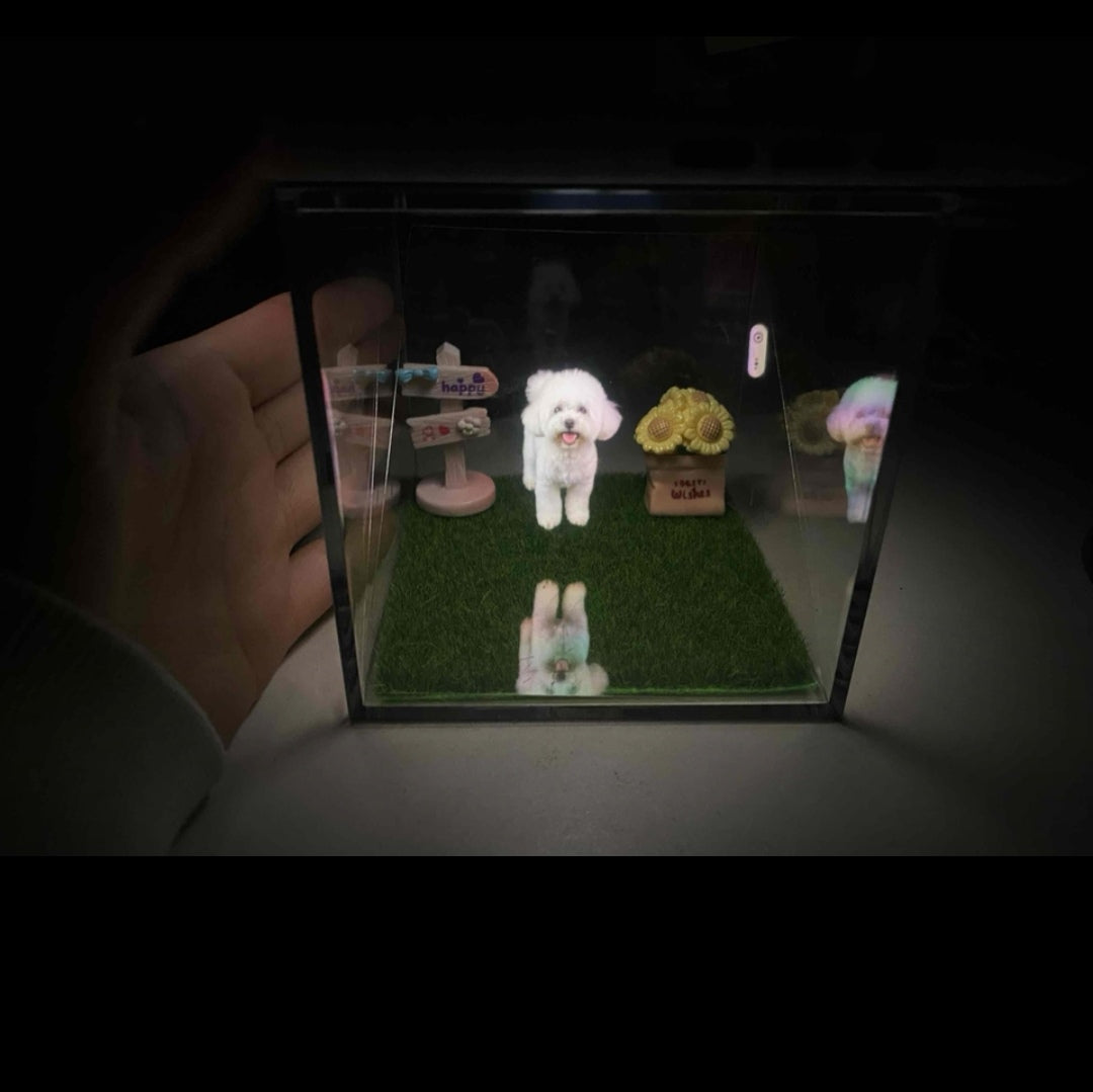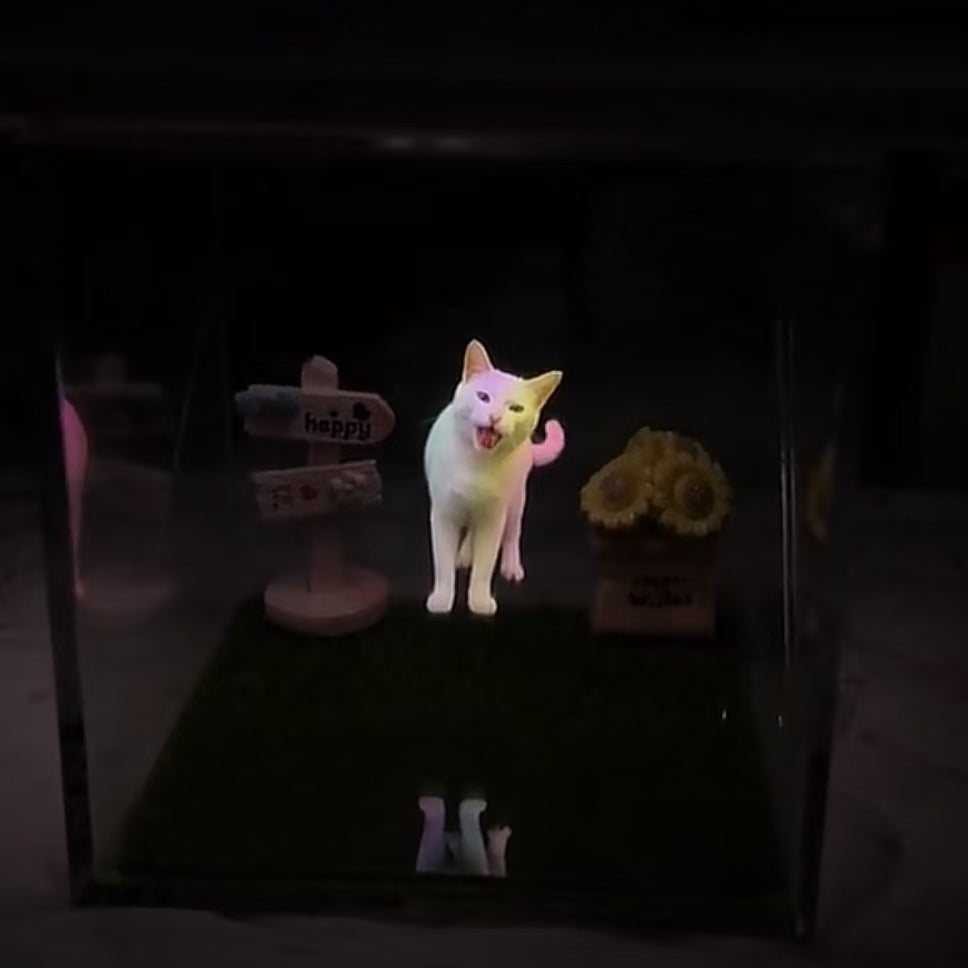 Absolutely obsessed! I was worried the hologram wouldn't look clear, but it captures Luna's sassy expression perfectly. The little moss garden at the bottom is such a cute touch. It’s now the centerpiece of my living room! -