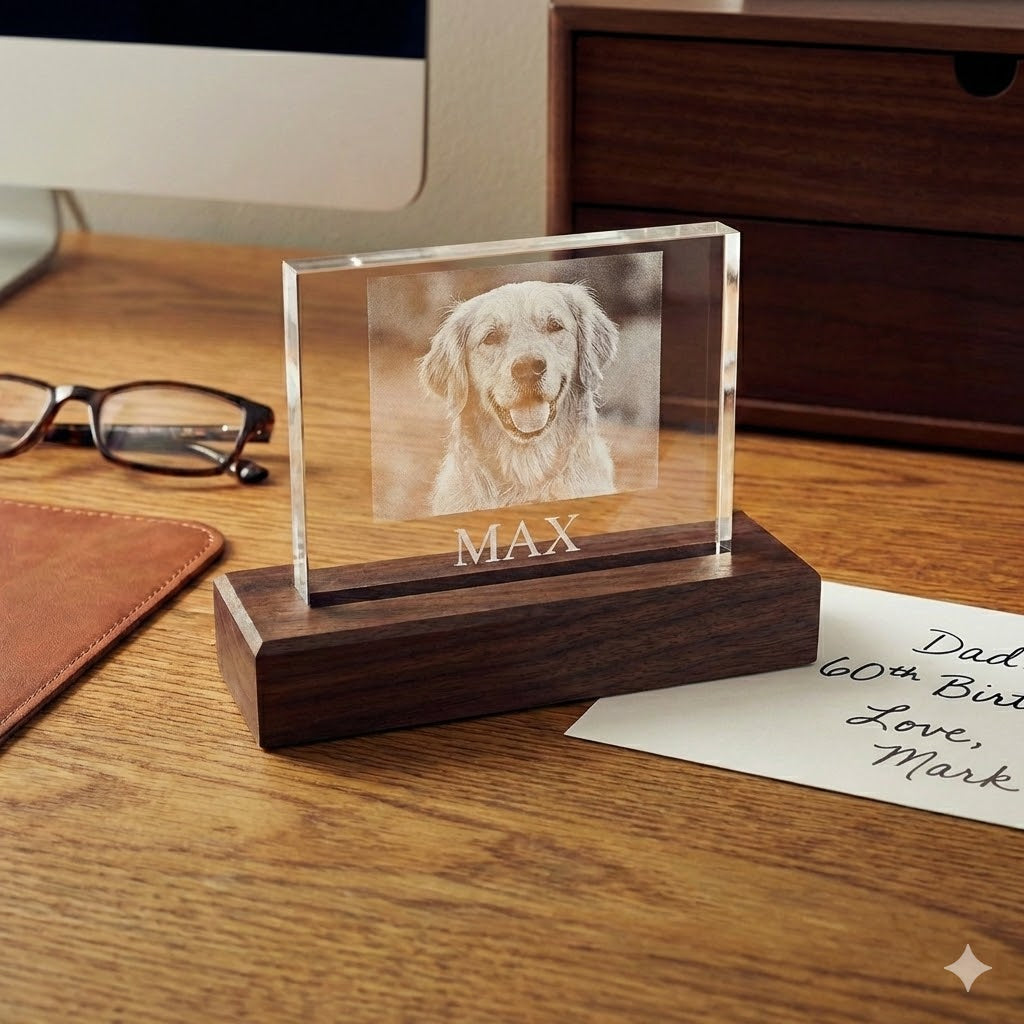 Got this for my dad's 60th birthday. He's a tough guy who rarely shows emotion, but he teared up seeing his old dog Max again. The wooden base feels very premium and fits perfectly on his office desk. Best gift I've ever given. -